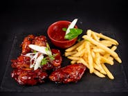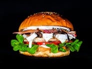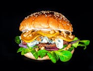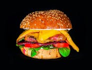 Zloženie: hovädzie mäso, cheddar, dvojitá slanina, cibuľa, polníček, Monkey dressing, BBQ omáčka + 100g hranoliek
